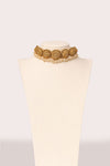 A handcrafted choker that blends old-world artistry with modern elegance. Intricately carved gold-toned motifs sit in perfect symmetry, framed with clusters of luminous pearls that soften the piece with a romantic touch. Designed to sit high on the neckline, this statement choker adds regal charm to bridal and festive looks alike.